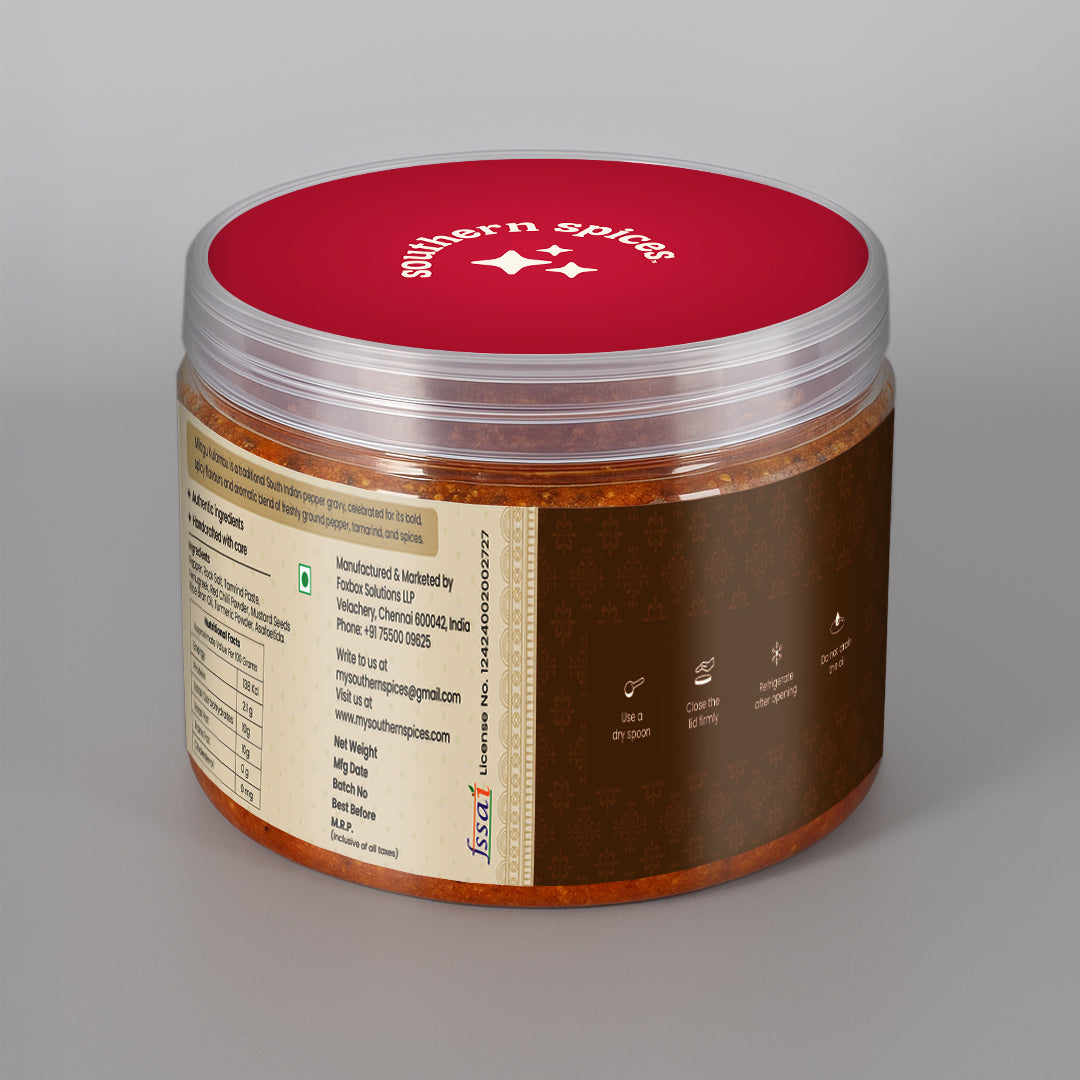 Milagu Kulambu is a traditional South Indian pepper gravy, crafted with freshly ground black pepper, tamarind, and a fragrant mix of spices. Known for its bold, spicy, and tangy flavour, this wholesome dish pairs perfectly with steamed rice, adding comfort and authenticity to every meal.