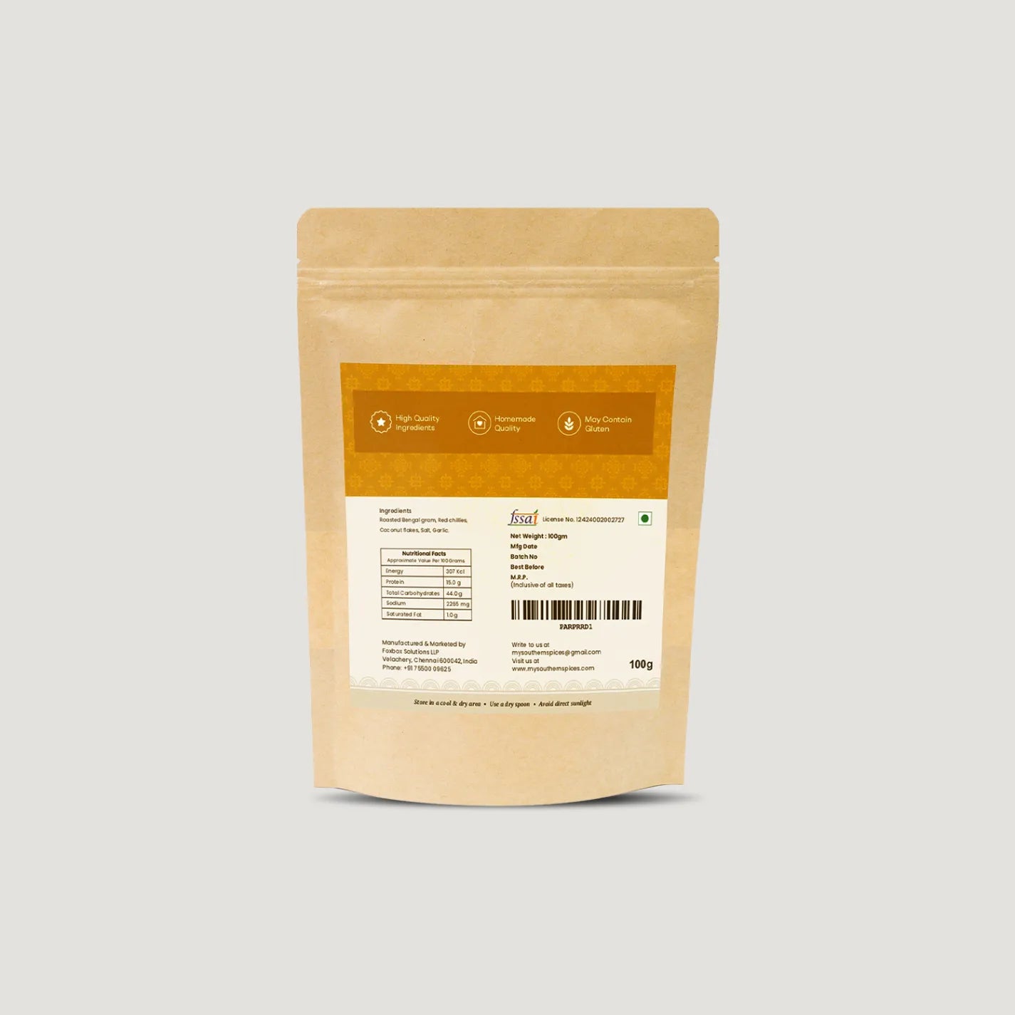 Paruppu Podi, crafted from traditional South Indian recipes, brings the wholesome comfort of homemade flavours right to your table. This specially curated blend features roasted Bengal gram, fiery red chillies, aromatic coconut flakes, garlic, and a touch of salt—each ingredient carefully chosen for its quality, freshness, and authentic taste.